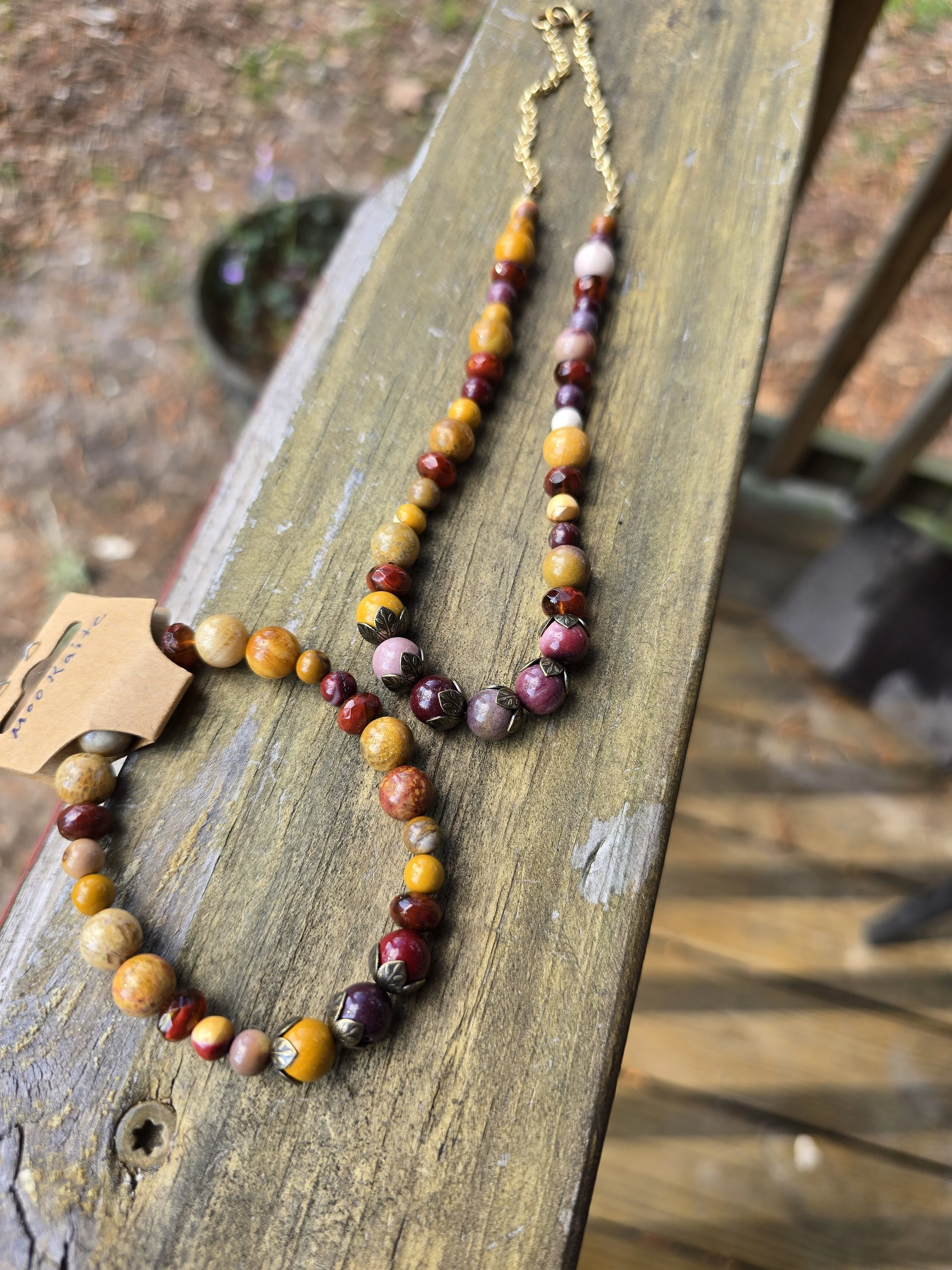 A warm, earthy jewelry set featuring rich mookaite beads paired with sparkling faceted quartz rondelles and six‑petal bead caps. The necklace closes with a lobster clasp, while the coordinating bracelet offers easy wear with a comfortable stretch band. A grounded, sunset‑toned duo for clarity, courage, and everyday magic.