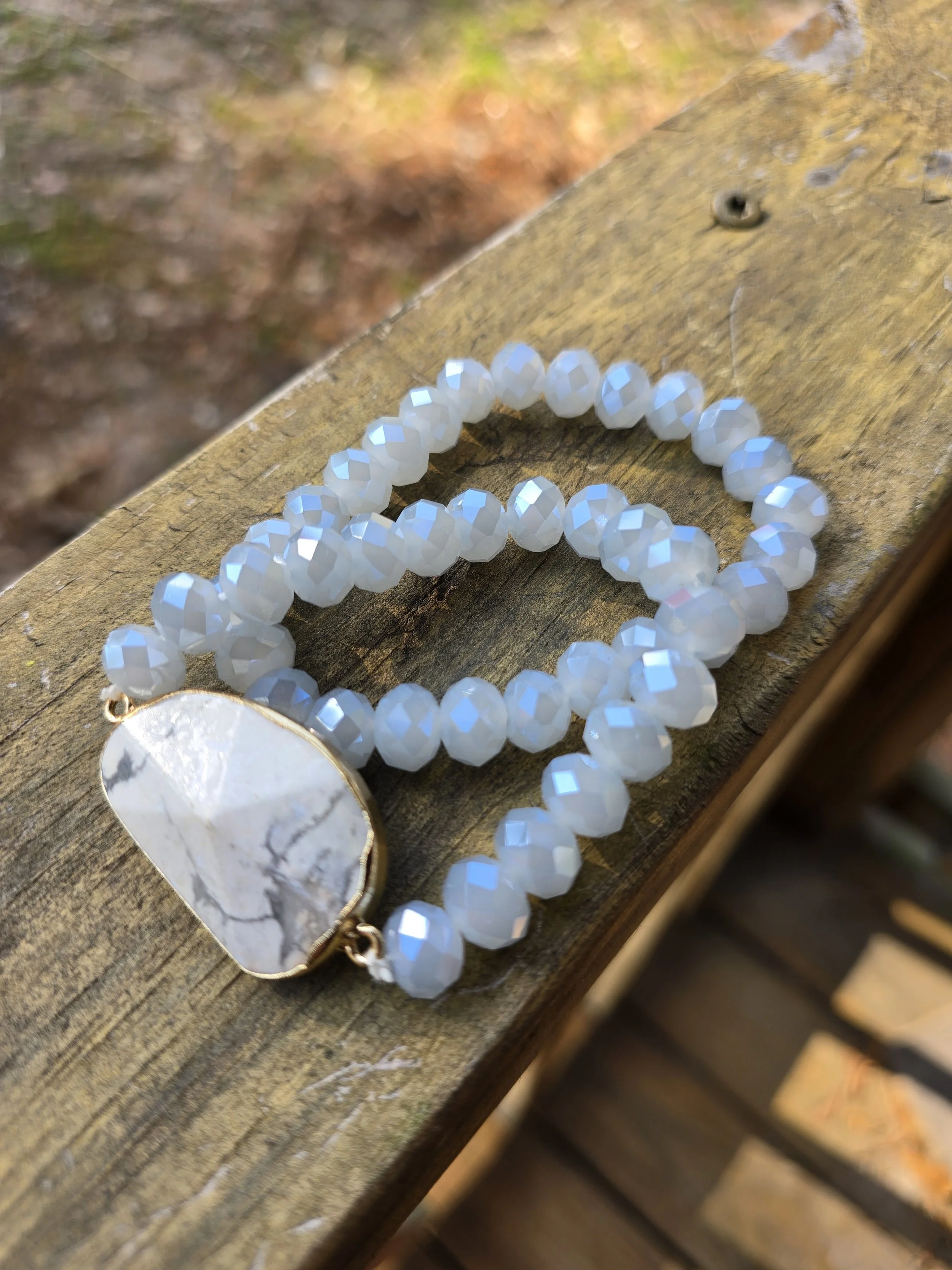 A serene stackable duo featuring soft blue chalcedony beads paired with a marbled magnesite link focal. Wear them together for a layered, sky‑washed calm, or separately when you want a touch of clarity and ease.